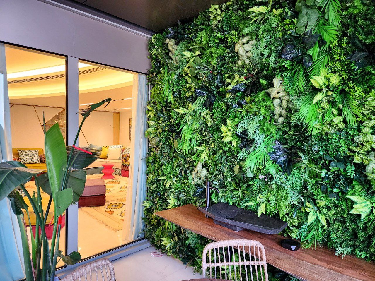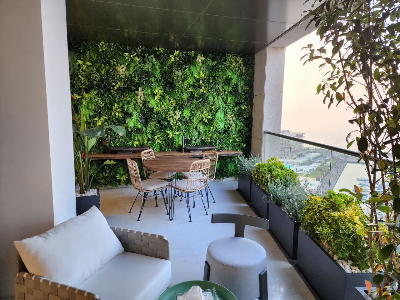 The interior landscaping of the luxurious apartments by the sea offers stunning views of the sea and a bright lush greenery. The entrance is made of a mixture of artificial and natural green wall embedded in different shapes within the wall. The living room features a mixture of natural materials like bamboo, teak, and river rocks, which creates a relaxed, island-inspired feel. The bedrooms feature soothing neutral colors of floating plants that are perfectly for a natural and calming atmosphere. These plants are easy to maintain and require minimal sunlight. We planted succulents, peace lilies, snake plants which plays a major role in reducing stress, improving air quality and help to combat fatigue. The bathrooms are designed with both styles and practicality in mind. With its breathtaking views, relaxing atmosphere and exquisite interior landscaping, the fireplace installed in one of the apartments was a piece of art that given a cozy atmosphere to the space.